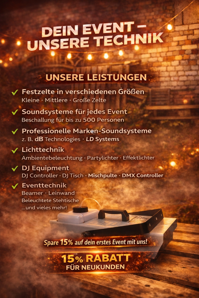 Sie möchten unsere Technik oder Zelte für ein ganzes Wochenende oder mehrere Tage mieten? Schreiben Sie uns einfach eine Anfrage über das Kontaktformular – wir erstellen Ihnen ein individuelles Angebot.